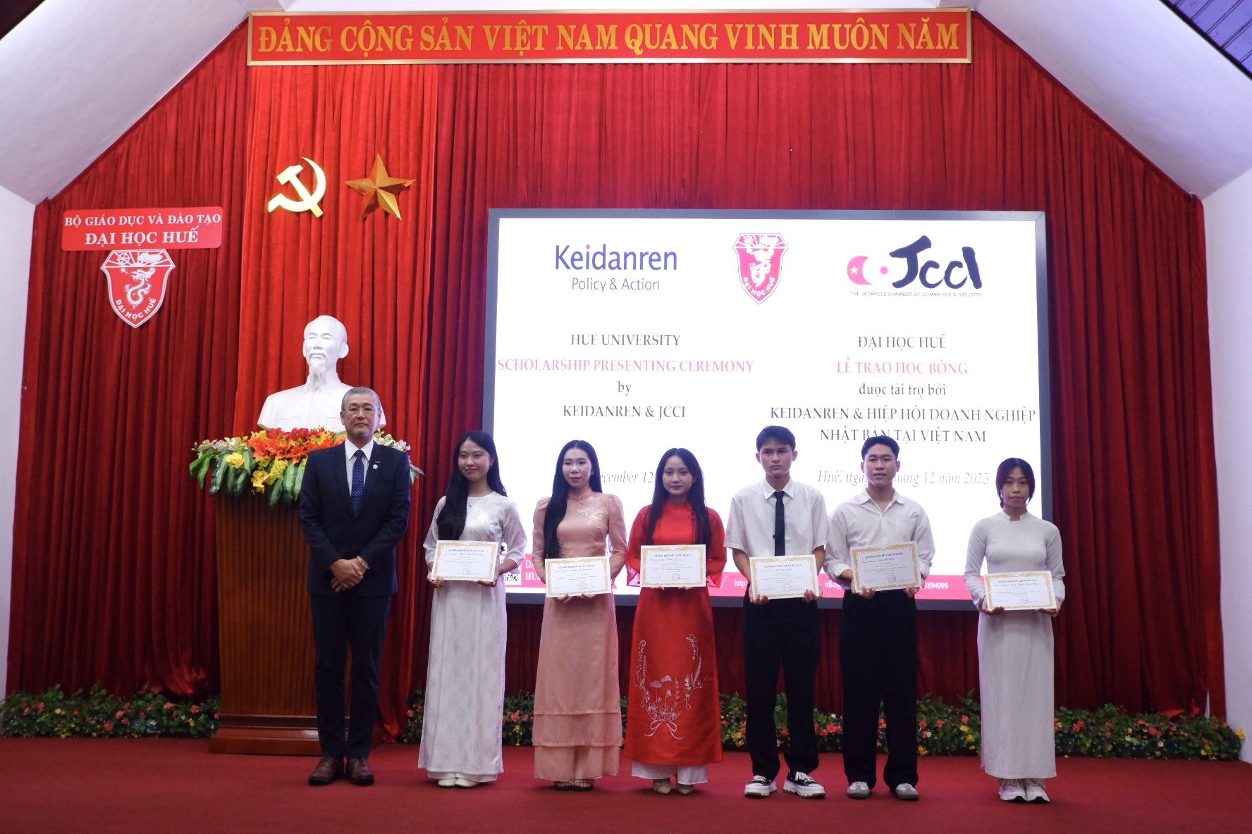 Ngày 12/12/2025, Đại học Huế tổ chức Lễ trao học bổng Keidanren và JCCI dành cho 20 sinh viên có thành tích tốt trong học tập. Chương trình do Liên đoàn Kinh tế Nhật Bản (Keidanren) và Hiệp hội Doanh nghiệp Nhật Bản tại Việt Nam (JCCI) tài trợ, nhằm khuyến khích tinh thần học tập, bồi dưỡng nguồn nhân lực chất lượng cao và tăng cường giao lưu, hợp tác giáo dục Việt Nam – Nhật Bản.