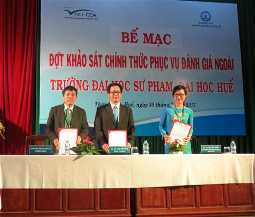 Sáng 30/7/2017, tại Giảng đường I diễn ra lễ bế mạc đợt khảo sát chính thức phục vụ đánh giá ngoài Trường Đại học Sư phạm, Đại học Huế. TS.Tạ Thị Thu Hiền, Phó Giám đốc Trung tâm kiểm định chất lượng giáo dục, Đại học Quốc gia Hà Nội, Giám sát viên; GS.TS.Mai Trọng Nhuận, Trưởng đoàn chuyên gia đánh giá ngoài; PGS.TS.Nguyễn Quang Linh, Giám đốc Đại học Huế đã dự lễ.