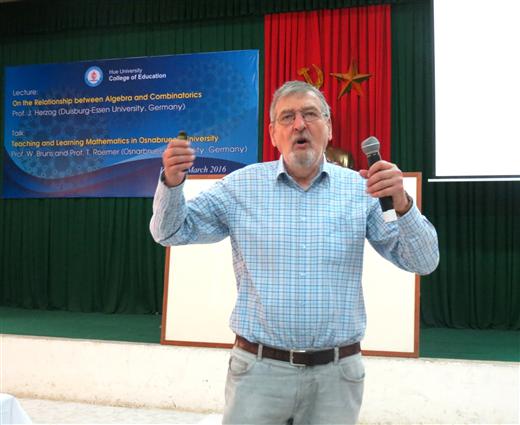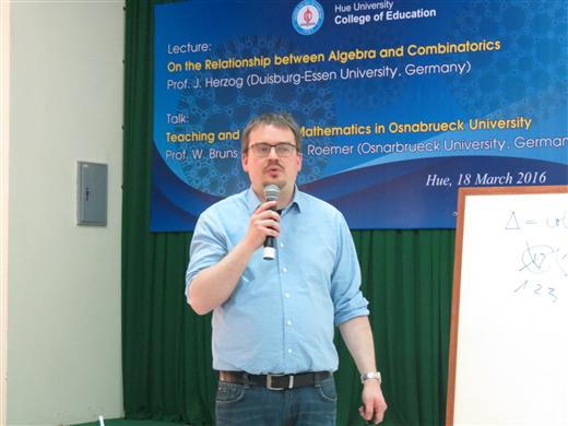 Sáng ngày 18/3/2016, Khoa Toán học - Trường Đại học Sư phạm Huế vinh dự đón tiếp hai nhà toán học danh tiếng người Đức: GS. Jurgen Herzog, Đại học Duisburg-Essen và GS. Tim Roemer, Đại học Osnarbrueck đến giảng bài và trao đổi khoa học tại Trường.