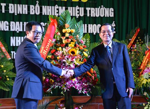 PGS.TS.Nguyễn Thám - Nguyên Hiệu trưởng Nhà trường (NK 2011 -2016) tặng hoa chúc mừng tân Hiệu trưởng.
