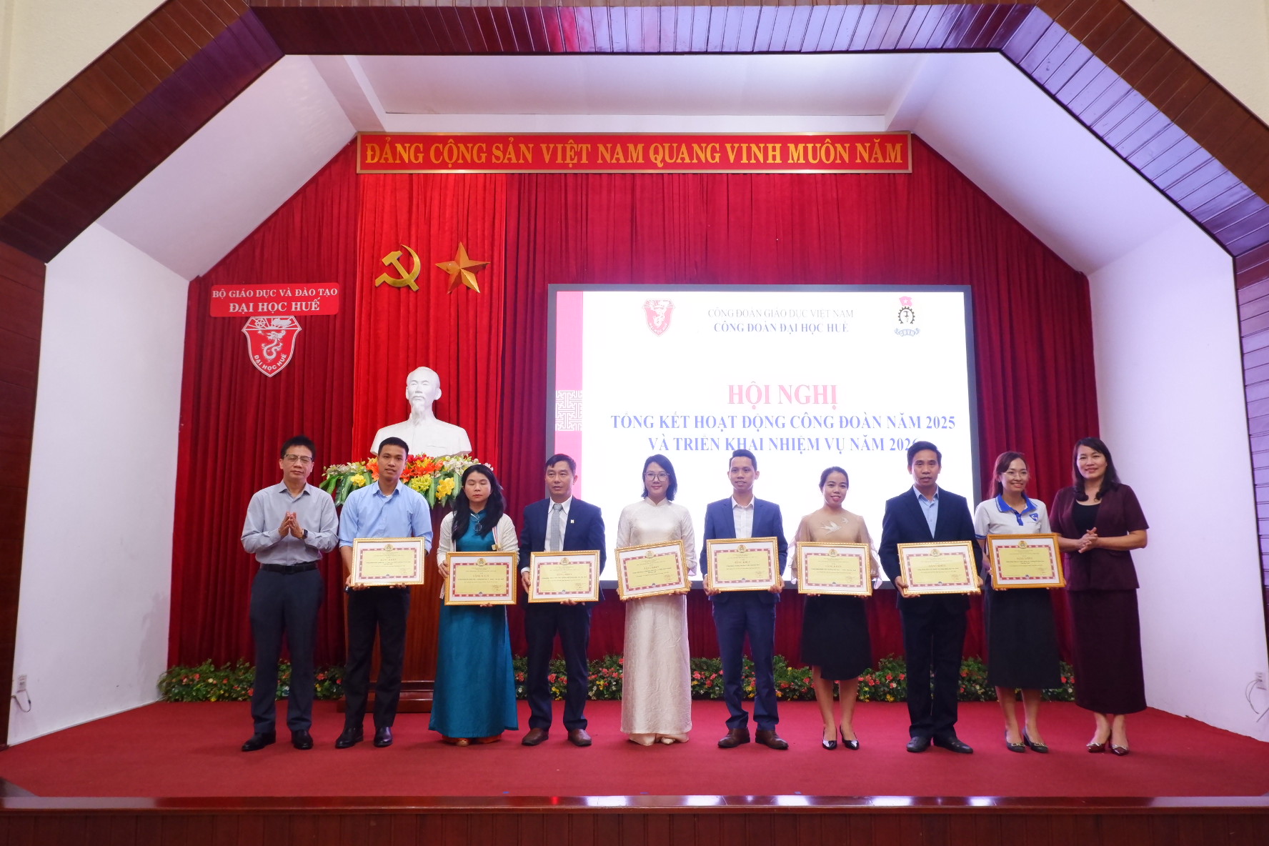 Sáng ngày 06/02/2026, Công đoàn Đại học Huế tổ chức Hội nghị Tổng kết hoạt động công đoàn năm 2025 và triển khai nhiệm vụ trọng tâm năm 2026. TS. Nguyễn Ngọc Ân, Ủy viên Ban Chấp hành Đảng bộ Bộ Giáo dục và Đào tạo, Ủy viên Đoàn Chủ tịch Tổng Liên đoàn Lao động Việt Nam, Chủ tịch Công đoàn Giáo dục Việt Nam; GS.TS. Trần Đăng Hòa, Phó Bí thư Phụ trách Đảng bộ Đại học Huế; TS. Bùi Văn Lợi, Phó Bí thư Đảng ủy, Phó Giám đốc Phụ trách Đại học Huế; PGS.TS. Đỗ Thị Xuân Dung, Ủy viên Ban Chấp hành Đảng bộ Đại học Huế, Phó Giám đốc Đại học Huế dự hội nghị.