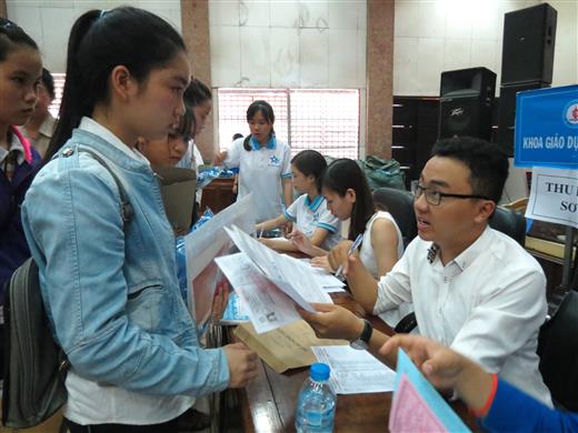 Tại Trường Đại học Sư phạm, Nhà trường sắp xếp thời gian nhập học theo nhóm ngành để các em làm thủ tục nhanh chóng, đơn giản nhất. Bên cạnh đó, đội sinh viên tình nguyện của Đoàn Thanh niên Trường hăng hái, nhiệt tình chỉ dẫn tân sinh viên viết hồ sơ và các bước làm thủ tục nhập học.