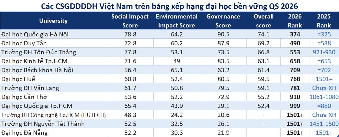 Ngày 18/11/2025, Tổ chức QS đã công bố kết quả Bảng xếp hạng Đại học Bền vững QS năm 2026 (QS Sustainability University Rankings 2026). Bảng xếp hạng này đánh giá tác động của các trường đại học trên các khía cạnh phát triển bền vững chính - môi trường, xã hội và quản trị (ESG); với vai trò không chỉ là trung tâm giáo dục và nghiên cứu mà còn là những nhà tuyển dụng lớn. Bảng xếp hạng này phù hợp với Mục tiêu 12.6 trong 17 Mục tiêu Phát triển Bền vững 2030 (SDGs 2030) của Liên Hợp Quốc.