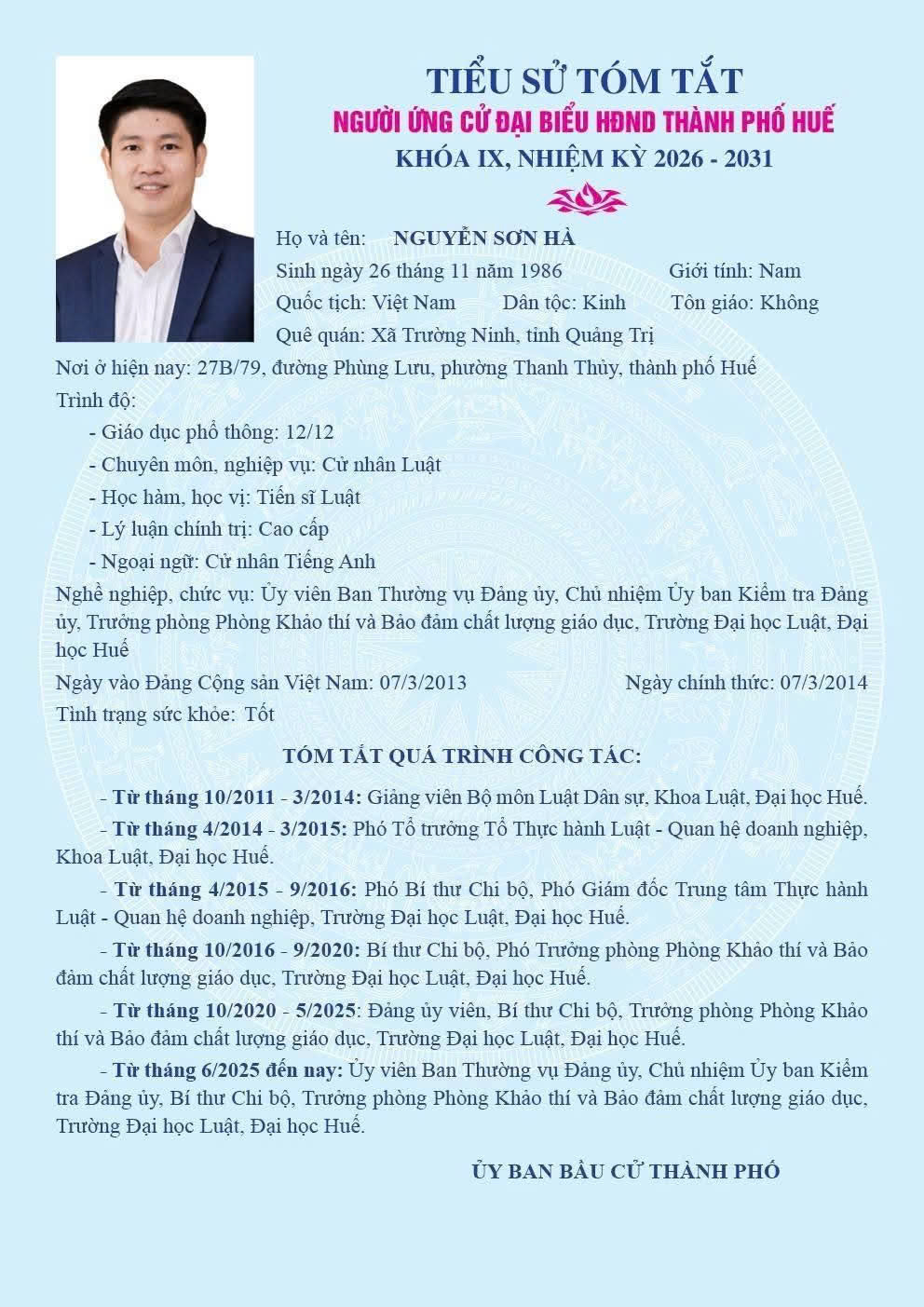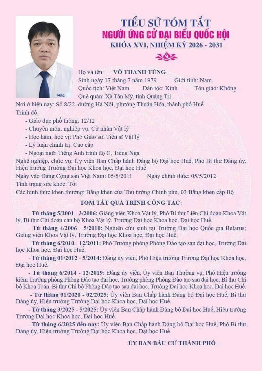 Ứng cử đại biểu Hội đồng nhân dân thành phố Huế khóa IX, nhiệm kỳ 2026–2031:
