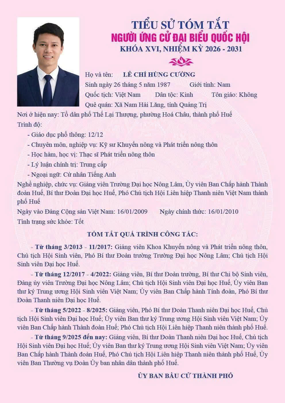 ![]() ThS. Lê Chí Hùng Cường, Giảng viên, Ủy viên Ban Thư ký Trung ương Hội Sinh viên Việt Nam, Bí thư Đoàn Thanh niên, Chủ tịch Hội Sinh viên Đại học Huế, Phó Chủ tịch Hội Liên hiệp Thanh niên Việt Nam thành phố Huế tham gia ứng cử tại Đơn vị bầu cử số 3 của thành phố Huế, gồm các phường: Vỹ Dạ, Thuận Hóa, An Cựu, Thủy Xuân, Phú Bài, Hương Thủy, Thanh Thủy. Tại đơn vị này có 04 người ứng cử, cử tri sẽ bầu 02 đại biểu Quốc hội.