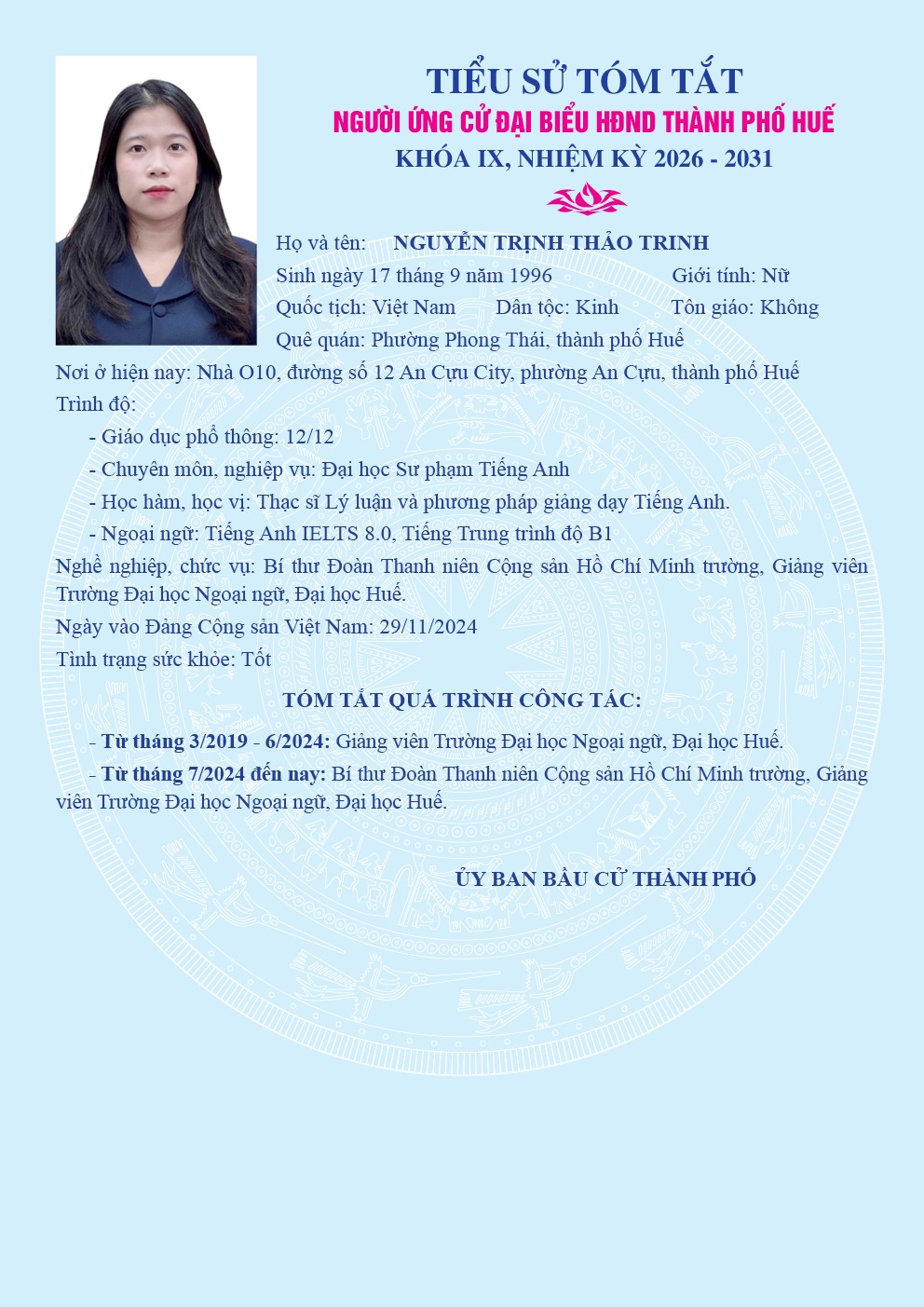 ![]() ThS. Nguyễn Trịnh Thảo Trinh, Giảng viên, Bí thư Đoàn Thanh niên Cộng sản Hồ Chí Minh Trường Đại học Ngoại ngữ, Đại học Huế tham gia ứng cử tại Đơn vị bầu cử số 6, gồm các phường: Thuận Hóa và Vỹ Dạ. Tại đơn vị này có 08 người ứng cử, cử tri sẽ bầu 05 đại biểu HĐND thành phố Huế.