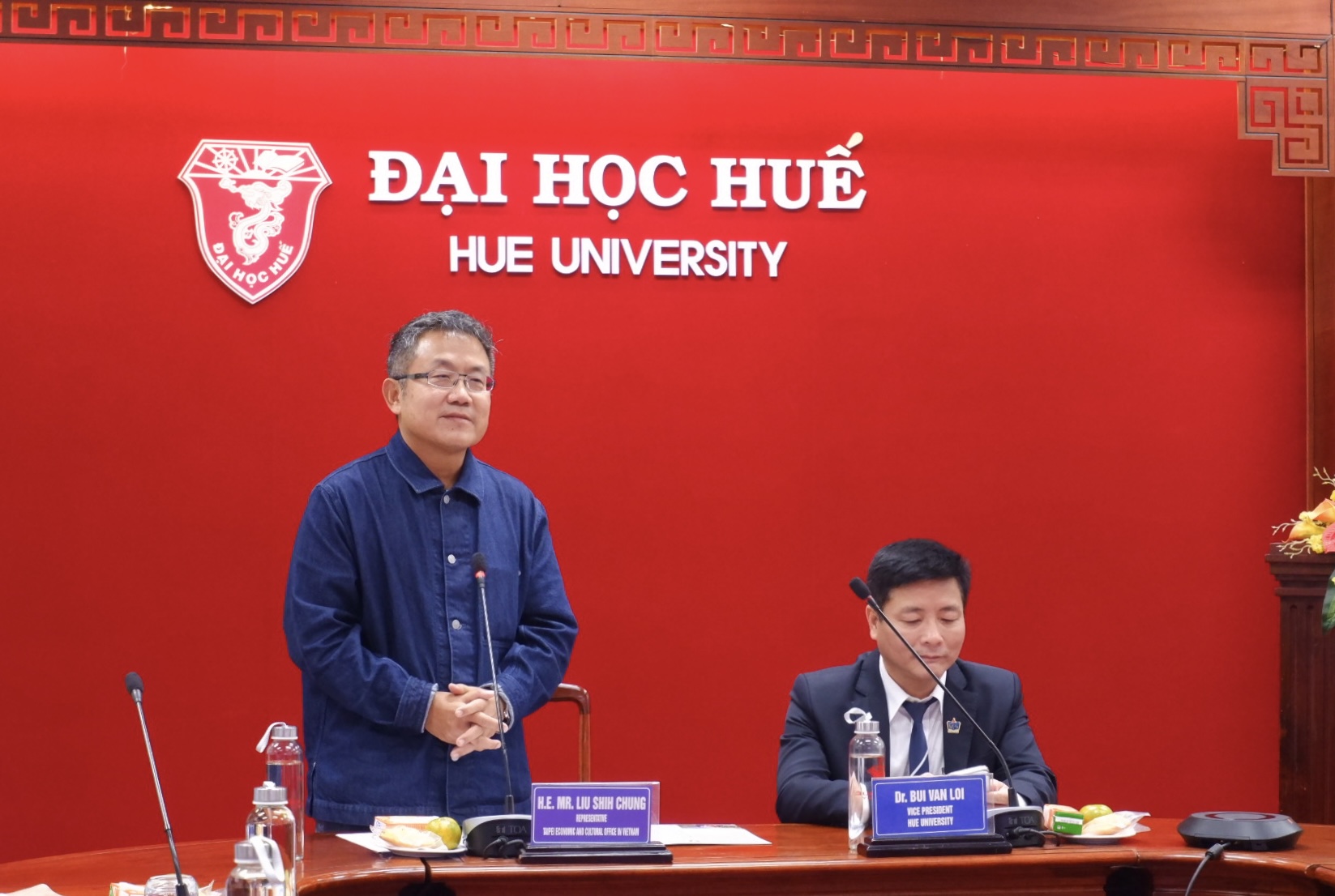 Phát biểu tại buổi tiếp đoàn, TS. Bùi Văn Lợi - Phó Bí thư Đảng ủy, Phó Giám đốc phụ trách Đại học Huế bày tỏ vui mừng được đón tiếp đại diện Văn phòng Kinh tế và Văn hóa Đài Bắc tại Việt Nam đến thăm và làm việc. TS. Bùi Văn Lợi cho biết trong chiến lược phát triển và hội nhập quốc tế, Đại học Huế luôn coi trọng việc tăng cường quan hệ hợp tác với các đối tác tại Đài Loan (Trung Quốc). Trong những năm qua, hợp tác giữa Đại học Huế và các cơ sở giáo dục, nghiên cứu của Đài Loan (Trung Quốc) đã đạt được nhiều kết quả tích cực, đặc biệt trong các lĩnh vực đào tạo, nghiên cứu khoa học và trao đổi giảng viên, sinh viên.