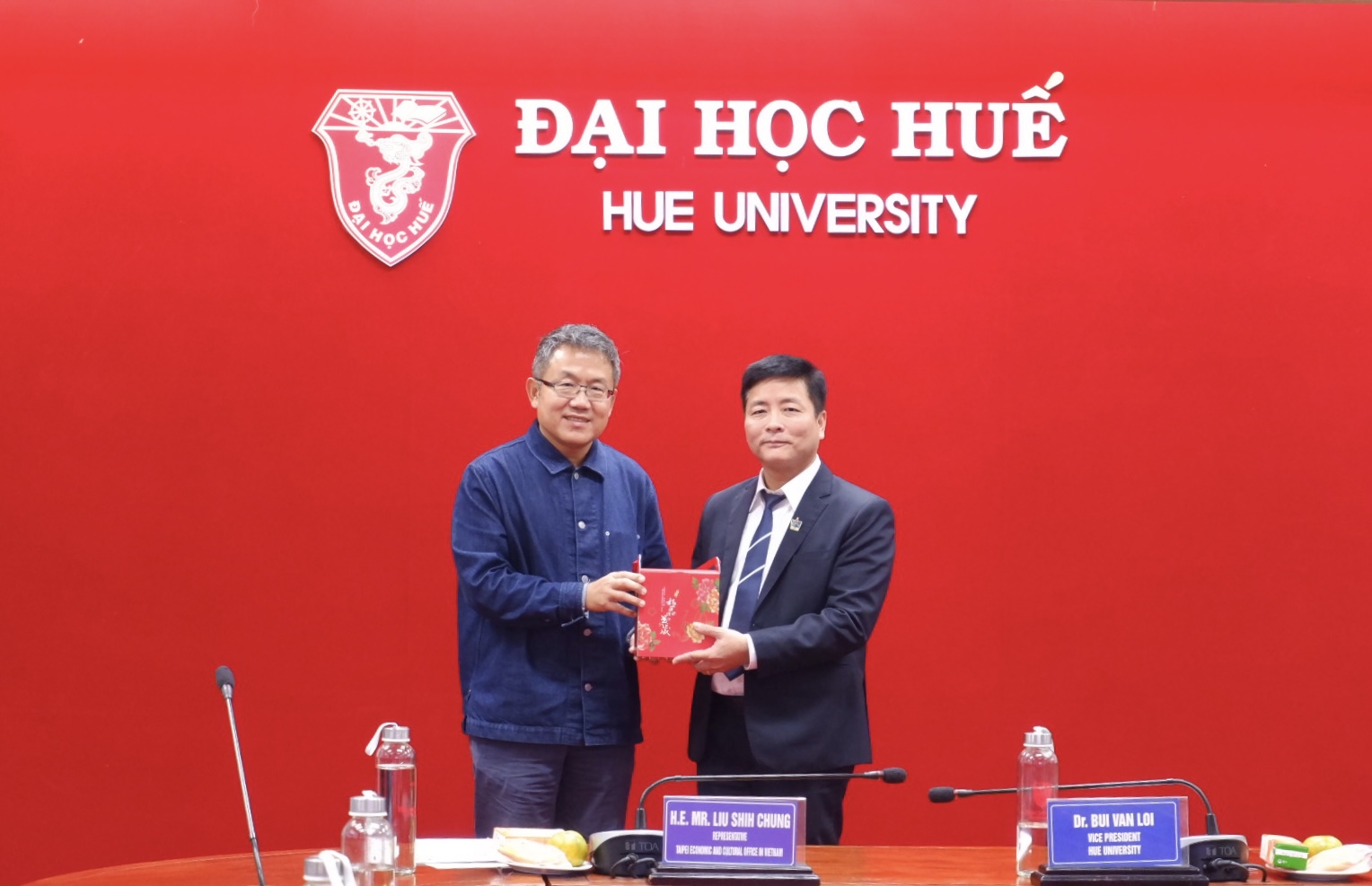 Ngày 19/12/2025, Đại học Huế có buổi tiếp và làm việc với Văn phòng Kinh tế và Văn hóa Đài Bắc tại Việt Nam do ông Lưu Thế Trung, Trưởng đại diện Văn phòng làm trưởng đoàn. Tham dự cùng đoàn có ông Trương Nãi Giới - Bí thư Phòng Hành chính, Văn phòng Kinh tế và Văn hóa Đài Bắc tại Việt Nam. Tiếp đoàn, về phía Đại học Huế có TS. Bùi Văn Lợi - Phó Bí thư Đảng ủy, Phó Giám đốc phụ trách Đại học Huế; đại diện lãnh đạo Văn phòng, Ban Khoa học Công nghệ và Quan hệ Quốc tế, Ban Đào tạo và Công tác Sinh viên.