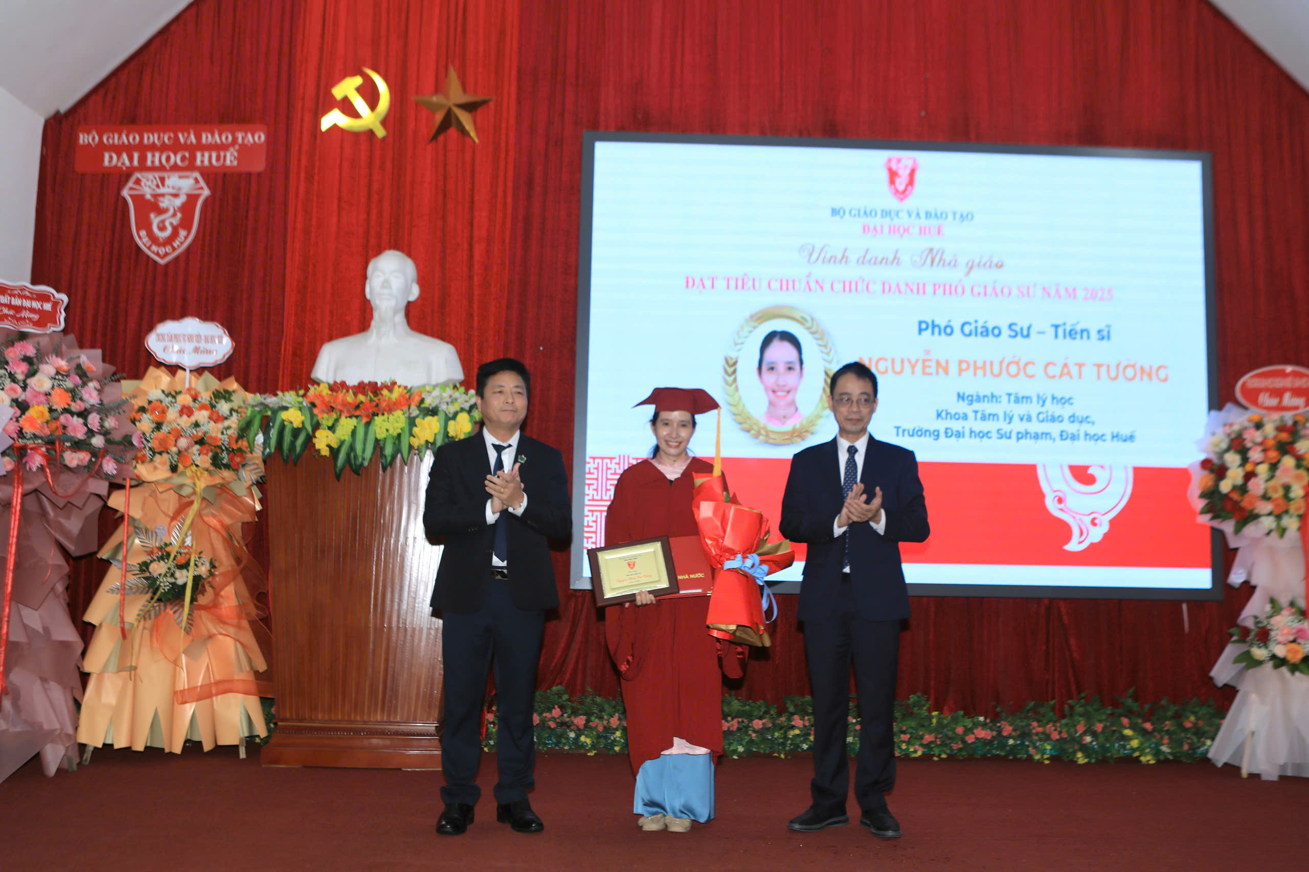 Thay mặt Hội đồng Giáo sư Nhà nước, lãnh đạo Đại học Huế đã công bố các quyết định và trao Giấy chứng nhận đạt tiêu chuẩn chức danh GS, PGS năm 2025 cho 40 nhà giáo và công bố quyết định khen thưởng dành cho các nhà giáo đạt chuẩn chức danh PGS trước 40 tuổi.