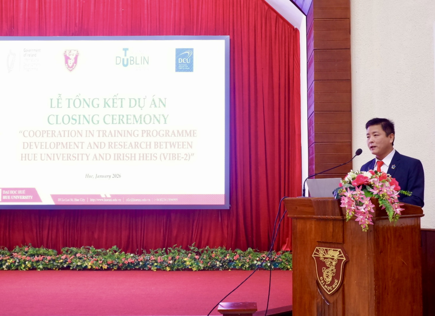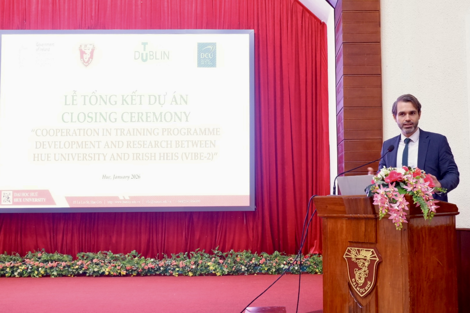 Ngày 15/01/2026, Đại học Huế tổ chức Lễ tổng kết Dự án VIBE 2 (Vietnam – Ireland Bilateral Education Project). Buổi Lễ có sự tham dự của Ông Ronan Cunniffe, Phó Đại sứ Ireland tại Việt Nam; bà Vũ Thị Minh Thủy, Phụ trách Chương trình cùng các chuyên gia, giáo sư đến từ Đại học Công nghệ Dublin và Đại học Dublin City (Ireland). Về phía Đại học Huế có TS. Bùi Văn Lợi, Phó Giám đốc phụ trách Đại học Huế, Trưởng Ban Quản lý Dự án; PGS.TS. Đỗ Thị Xuân Dung, Phó Giám đốc Đại học Huế và các thành viên dự án VIBE.
