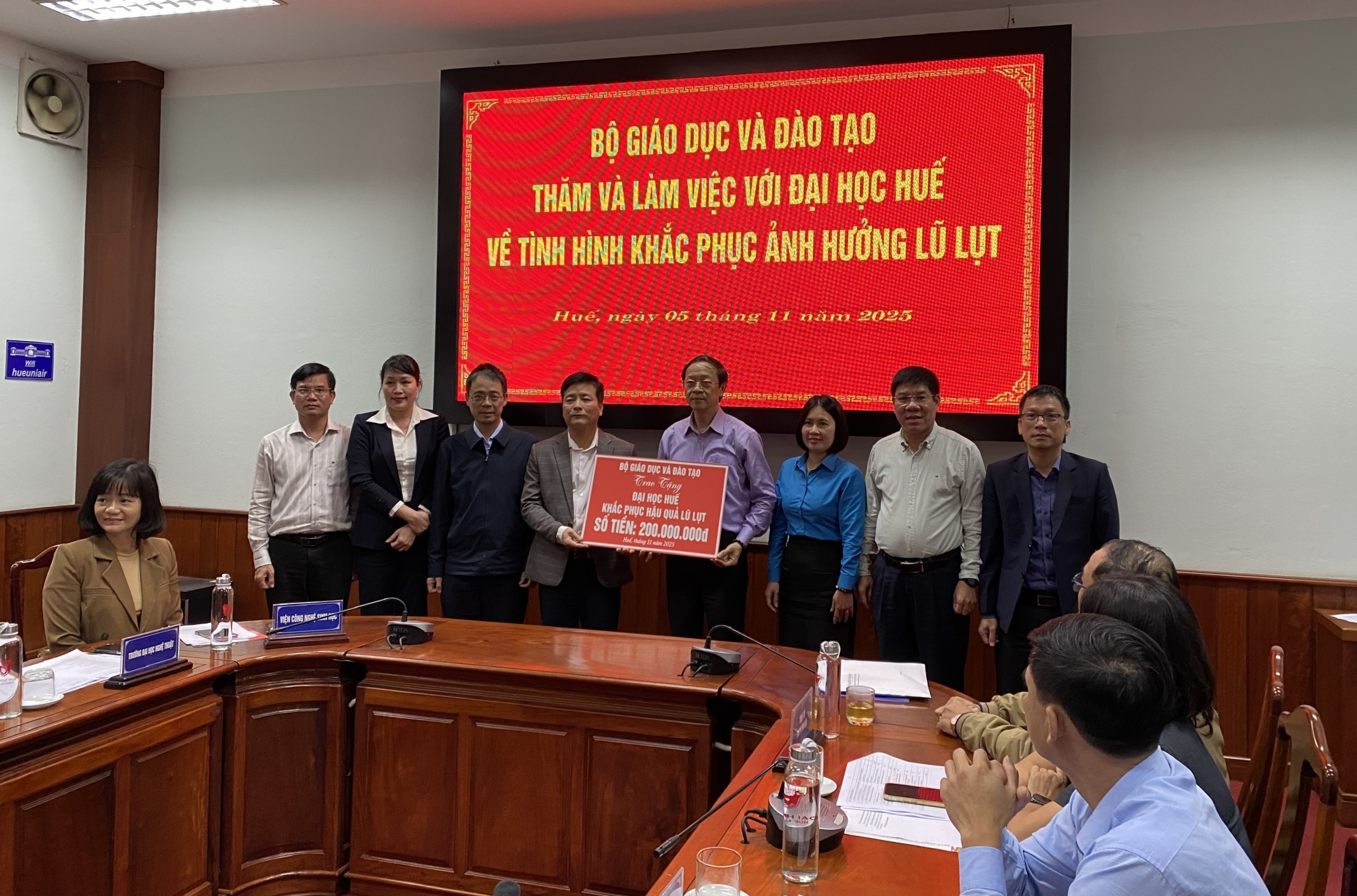 Dịp này, Đoàn công tác Bộ Giáo dục và Đào tạo đã trao tặng 200 triệu đồng hỗ trợ Đại học Huế khắc phục hậu quả mưa lũ. Thay mặt lãnh đạo Đại học Huế, TS. Bùi Văn Lợi, Phó Giám đốc Phụ trách Đại học Huế cảm ơn sâu sắc đến lãnh đạo Bộ Giáo dục và Đào tạo đã kịp thời quan tâm, chia sẻ khó khăn, chỉ đạo sát sao. Đại học Huế tiếp tục nỗ lực, phát huy tinh thần vượt khó, quyết tâm sớm ổn định, khôi phục hoạt động dạy – học.