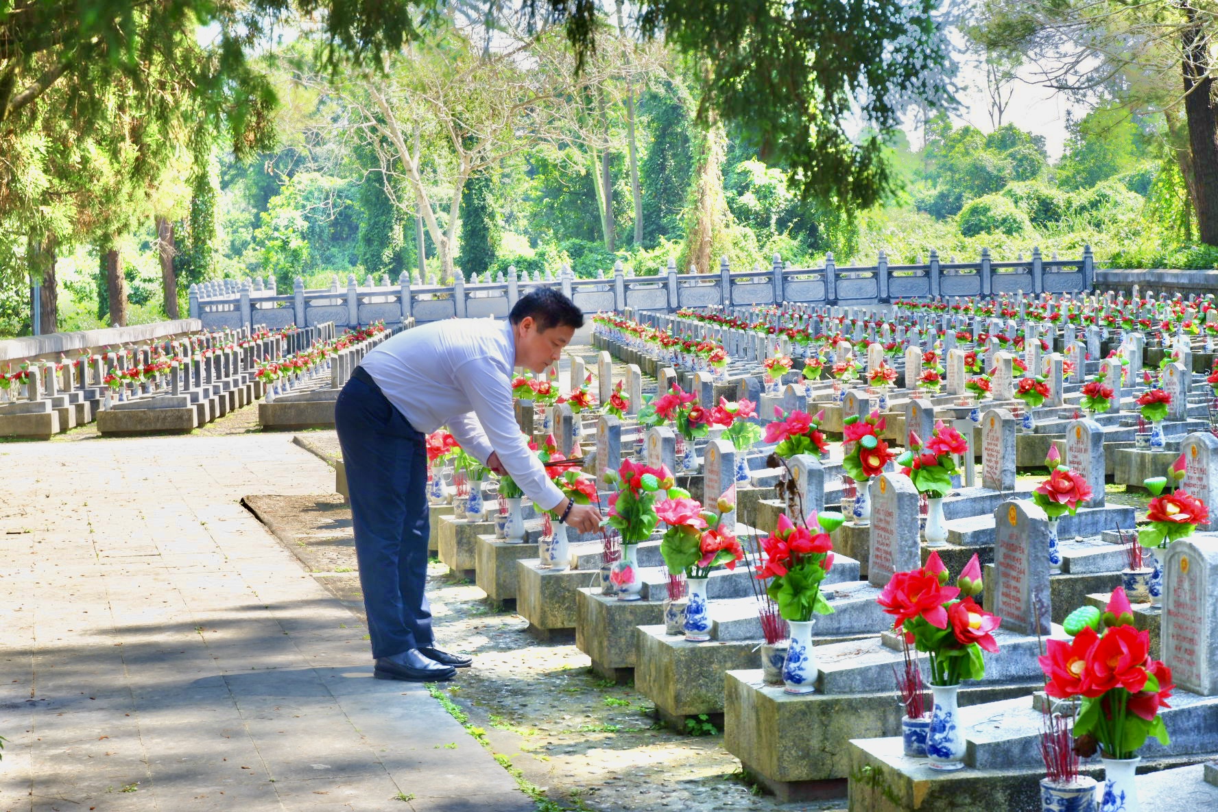 Tiếp đó, đoàn đã đến đặt vòng hoa, dâng hương tưởng niệm tại Nghĩa trang Liệt sĩ Quốc gia Đường 9 và Nghĩa trang Liệt sĩ Quốc gia Trường Sơn – nơi yên nghỉ của hơn 21.000 anh hùng liệt sĩ đến từ khắp mọi miền đất nước.