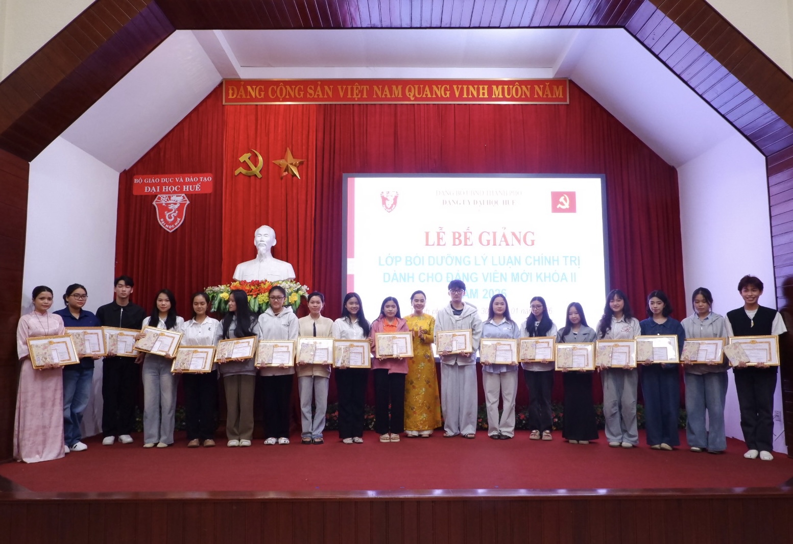 Ngày 30/01/2026, Đảng ủy UBND Thành phố Huế phối hợp với Đảng ủy Đại học Huế tổ chức Lễ Bế giảng Lớp Bồi dưỡng lý luận chính trị dành cho đảng viên mới Khóa II năm 2026. Dự Lễ có Đồng chí Đinh Thị Như Hiền, Thành ủy viên, Phó Bí thư Đảng uỷ UBND thành phố Huế; đồng chí Phạm Thanh Bình, Đảng ủy viên, Phó Trưởng Ban Tuyên giáo và Dân vận, Đảng uỷ UBND thành phố Huế; GS.TS. Trần Đăng Hòa, Phó Bí thư Phụ trách Đảng bộ Đại học Huế.