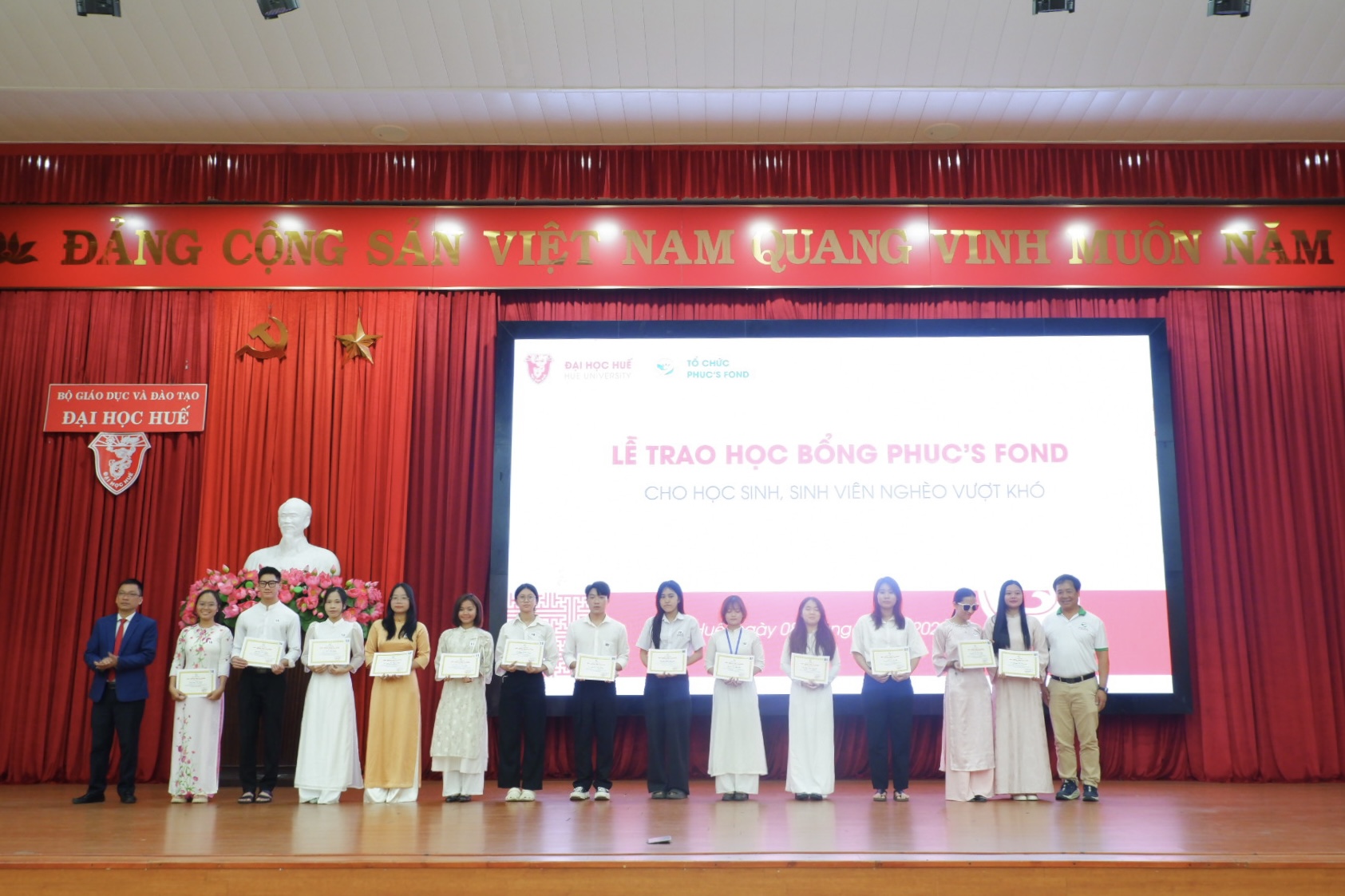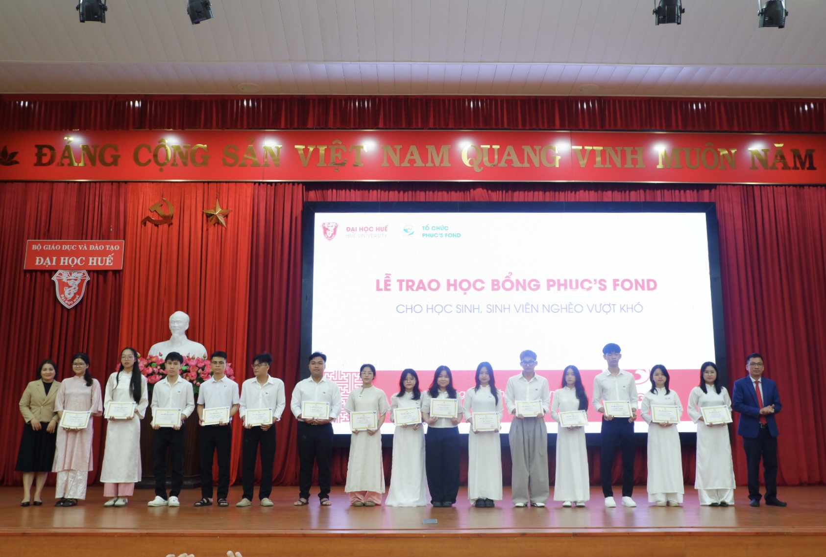 Tại chương trình, tổ chức Phuc’s Fond đã trao 244 suất học bổng cho sinh viên Đại học Huế và học sinh có hoàn cảnh khó khăn vươn lên trong học tập, với tổng trị giá hơn 1,7 tỷ đồng. Trong đó có 5 suất học bổng toàn phần (20 triệu đồng/suất), 24 suất học bổng bán phần (10 triệu đồng/suất), 24 suất học bổng trợ cấp (5 triệu đồng/suất), 61 suất học bổng dành cho sinh viên vượt khó (3 triệu đồng/suất). Dịp này, chương trình “Thắp sáng ước mơ” cũng đã trao 124 suất học bổng (8,4 triệu đồng/suất) cho học sinh nghèo hiếu học và 6 suất còn lại sẽ được trao vào tháng 4/2026.