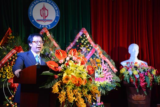Trong không khí trang trọng của buổi lễ, PGS.TS. Lê Anh Phương - Hiệu trưởng Nhà trường chân thành cảm ơn sự lãnh đạo của Bộ Giáo dục và Đào tạo, sự chỉ đạo trực tiếp của Đại học Huế, sự phối hợp chặt chẽ và tin cậy của các sở giáo dục địa phương đã dành cho Trường trong công tác đào tạo; các trường đại học sư phạm trong Câu lạc bộ các trường sư phạm trọng điểm đã chia sẻ với Trường trong mọi hoạt động. Đặc biệt, Trường trân trọng cảm ơn Trung tâm KĐCLGD - Đại học Quốc gia Hà Nội là đơn vị tư vấn trực tiếp tham gia đánh giá ngoài tại Trường, với tinh thần làm việc khách quan, chính xác, đoàn đã đánh giá những điểm mạnh, chỉ ra những điểm còn hạn chế để Nhà trường xây dựng chiến lược đảm bảo chất lượng trong những năm tiếp theo”. Hiệu trưởng Nhà trường cũng nhiệt liệt biểu dương các Khoa, Phòng, Viện, Trung tâm cùng tất cả cán bộ, viên chức, lao động, sinh viên, học viên, nghiên cứu sinh và học sinh trong toàn trường đã không ngừng nỗ lực phấn đấu để khẳng định uy tín của Trường trong thời gian qua.