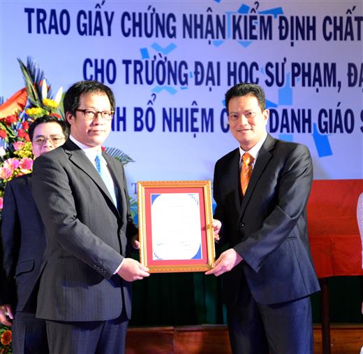 ![]() PGS.TS. Nguyễn Xuân Hải - Giám đốc Trung tâm Kiểm định chất lượng giáo dục, Đại học Quốc gia Hà Nội (bên phải ảnh) trao Giấy Chứng nhận kiểm định chất lượng giáo dục đại học cho Trường Đại học Sư phạm, Đại học Huế.