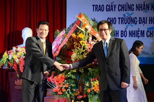 ![]() PGS.TS. Nguyễn Quang Linh - Giám đốc Đại học Huế (phải ảnh) tặng hoa chúc mừng Nhà trường.